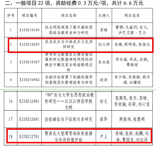 日前,学校科研处公布了2021年度校级科研项目立项结果,我院刘大伟、尹上两位教师主持的《武当武术与少林武术文化异同研究》《鄂西北大型滑雪场体育旅游与休闲价值评估》分获校级科研一般项目立项。