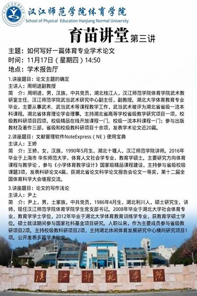 11月17日下午,vwin德赢ac米兰官网育苗讲堂第三讲在校图书馆学术报告厅开讲。第三讲聚焦体育专业学术论文撰写之道,邀请周明进副教授、王娇和尹上老师做主讲嘉宾,他们分别从论文选题、文献管理、论文谋篇布局及研究方法等模块解析学术论文撰写之道。vwin德赢ac米兰官网全体师生到场聆听,党总支书记赵盛国主持报告会。未能到校的实习生在线观看了讲座。