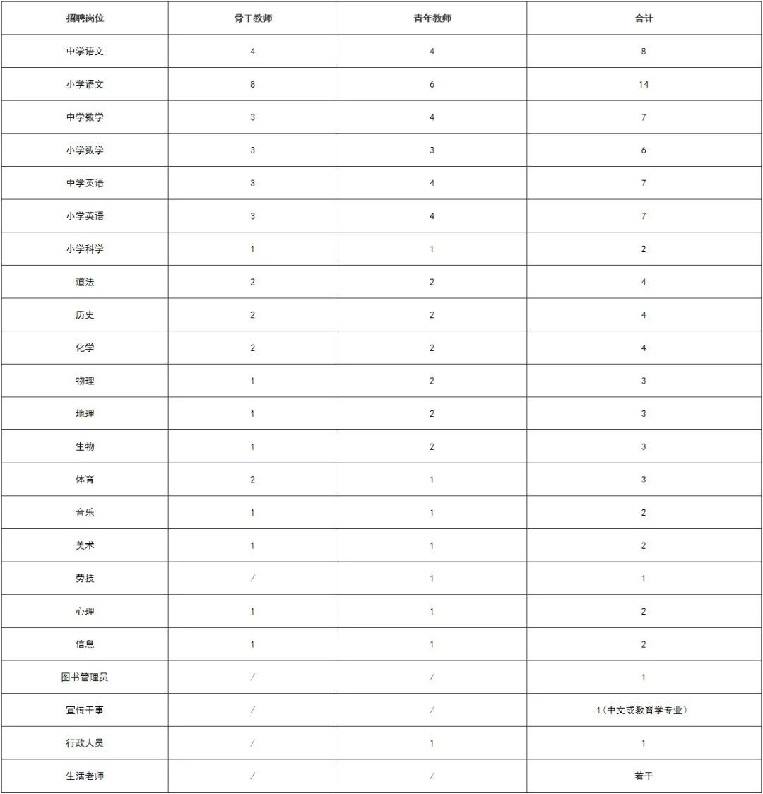 现根据学生规模,面向社会、全国师范类院校和一流高校诚聘初中、小学教师若干名,欢迎您加入我们!具体招聘学科、岗位及数量如下: