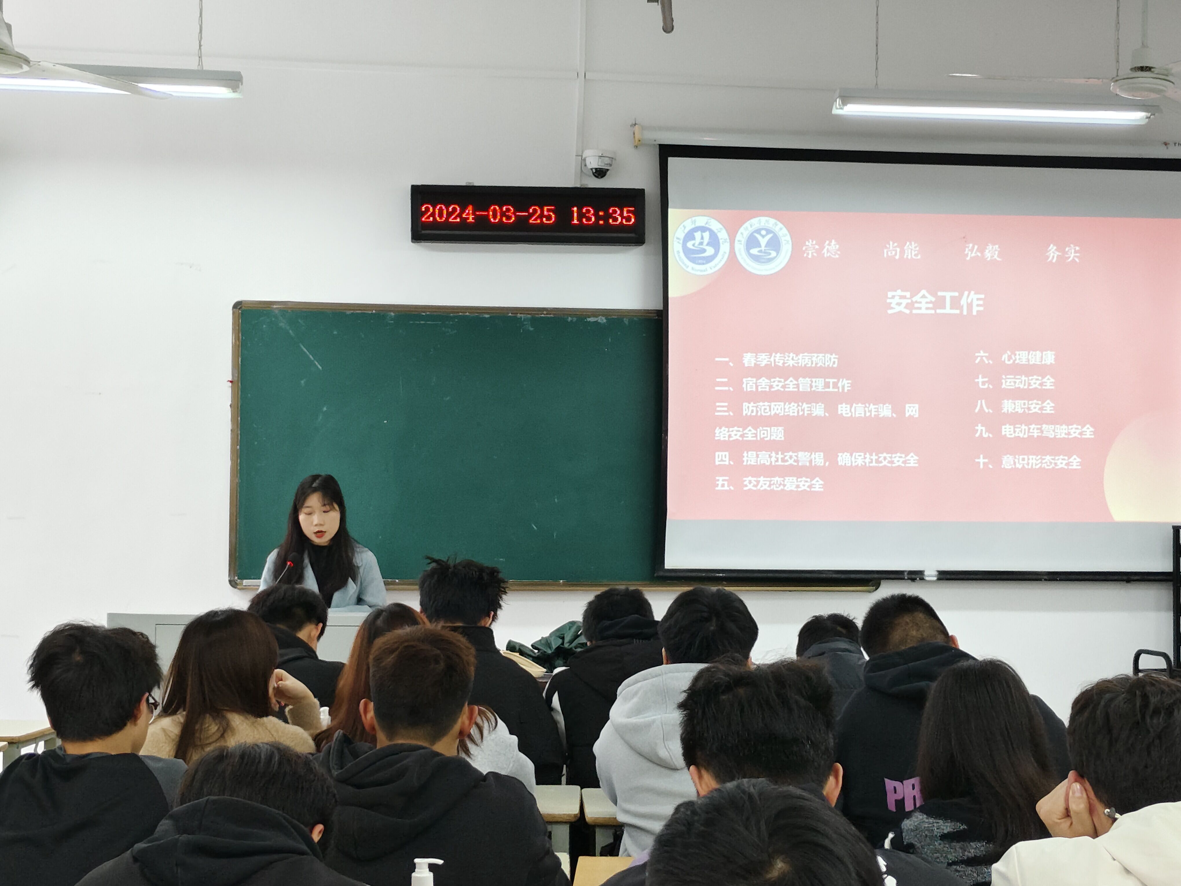 会议围绕春季传染病预防、宿舍安全管理工作,防范电信诈骗、社交安全、交友恋爱安全、心理安全、运动安全、兼职安全、电动车驾驶安全、意识形态安全等十方面部署安全工作,并通报了典型案例。