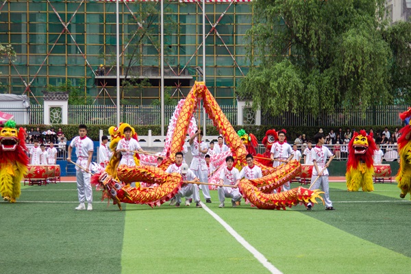 vwin德赢ac米兰官网潘成老师指导的战鼓表演,鼓震天地,热血激昂。舞龙舞狮气势如虹,踩着音乐节拍,队形变换多样,展现汉师体院学子的青春光彩。