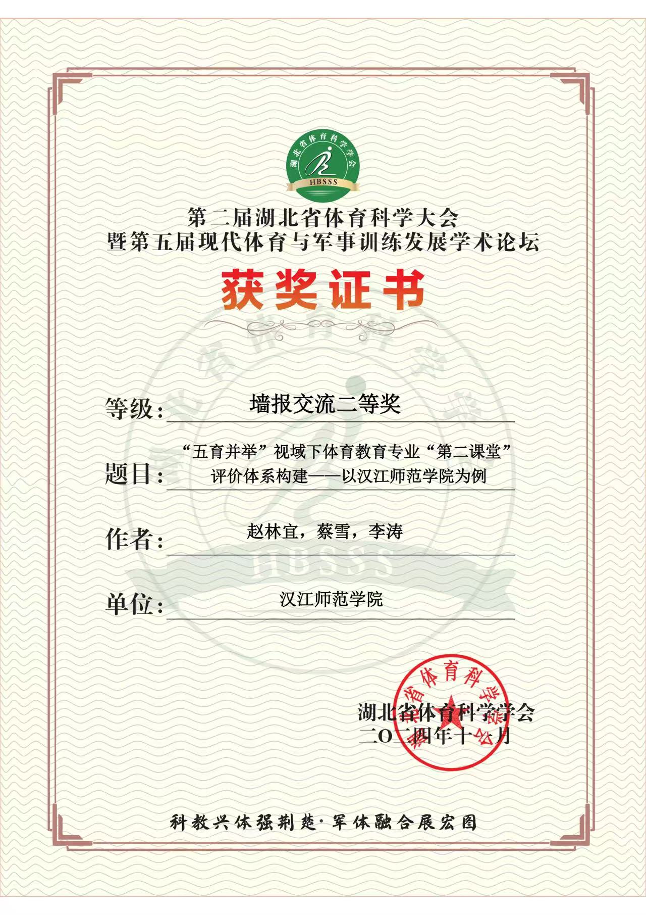 此次大会的成功举办,不仅为全省体育科学领域的专家学者提供了一个交流学习的平台,也为广大青年学子展示才华、实现梦想提供了宝贵机会。本次大会另有vwin德赢ac米兰官网李涛副教授指导,23级体育教育本科赵林宜同学《湖北省体育产业高质量发展助推体育强国战略实施路径研究》和24级体育教育本科胡欣冉同学《数字化背景下学校体育教育质量提高路径探究》二篇文章获得了本次大会的书面交流证书,以上所有成果都将收录在中国知网文献库中,相信在不久的将来,会有更多的汉师青年学子像赵林宜同学一样,在学术研究的道路上不断前行、勇攀高峰。