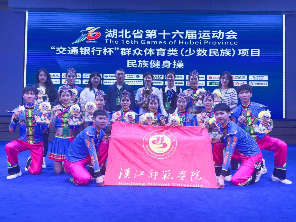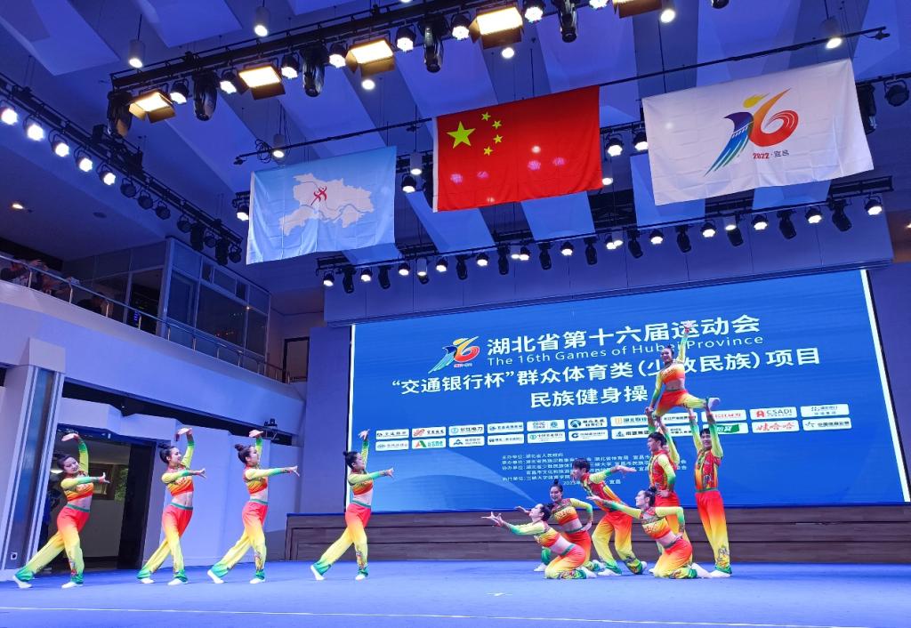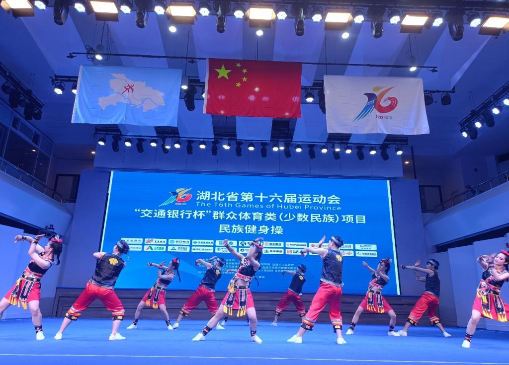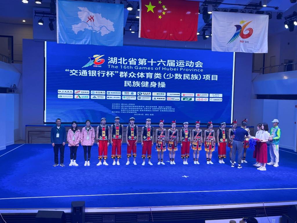 省第十六届运动会群众体育类(少数民族)民族健身操比赛于4月13日上午8:30在宜昌三峡大学开赛。十堰市委统战部(市民宗委)组织领队、教练员、运动员17人代表十堰市参赛。在市委统战部、学校领导的关心支持下,在教练员和队员的齐心协力下,在激烈的角逐中夺得规定动作项目铜牌,自选动作项目银牌,以全省团体总分第二的排名喜获银奖。
